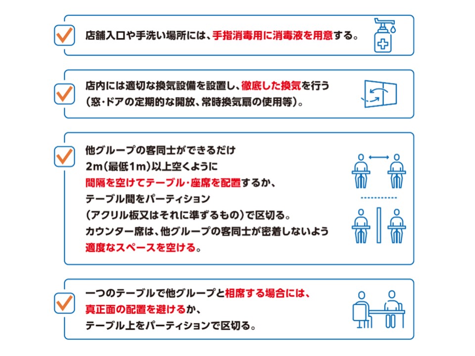 「Go To イート」は、新型コロナウイルスの感染予防対策に取り組む事業者を支援するキャンペーンです。そのため、Go To イート事業に参加登録するには、消毒液の設置やテーブルの間隔をあけて配置、「換気・声量・三密」を意識するなど感染予防対策に取組み、接触アプリの紹介をするなどを条件としています。