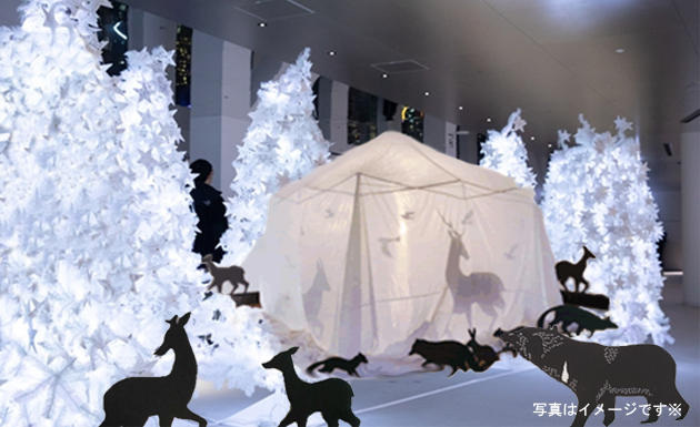 森の中からは、たくさんの動物たちが顔をのぞかせます。都会の真ん中にあらわれた白銀の世界で空中散歩。森全体が蒼い光でライトアップされ、幻想的な雰囲気です。