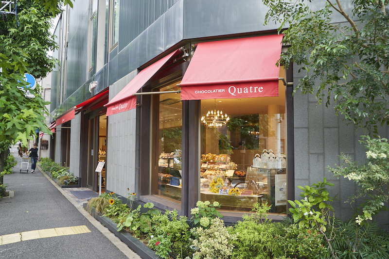 赤いひさしが目印のパティスリー「キャトル柿の木坂本店」。お店が少ないエリアに忽然と現れるのと、ショーウィンドウから見えるおいしそうなスイーツに誘われて、通りがかったら迷わず入ってしまう……、そんな店構えなのです。
