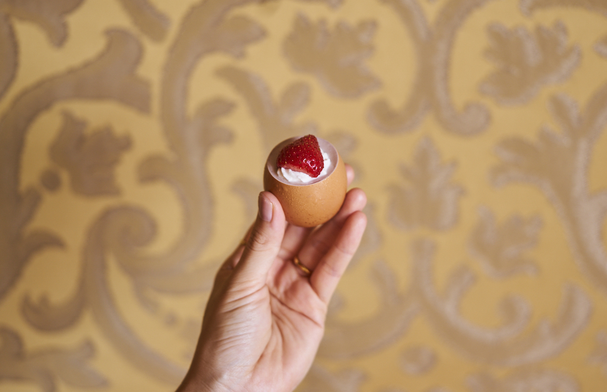 思わず、カフェスペースの壁紙を使ってインスタ写真もパチリ!ちょこんとトッピングされたイチゴがなんとも愛らしいです。卵1個分のボリュームですが3口ほどでいただけるので、1人で4種の食べ比べもできますよ。