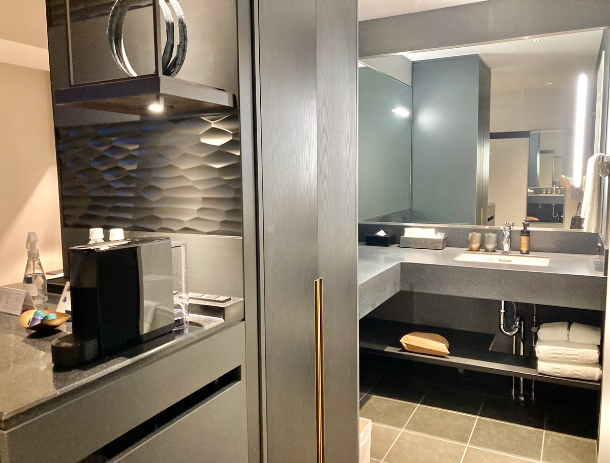 「エッセンシャル」は全126室のうち、大多数の64室を占めるザ・ゲートホテル両国を代表するお部屋です。とにかくスタイリッシュな印象ですが、お部屋の床は水面をイメージしたデザインが施され、家具も上品な光沢できらめくものが取り入れられています。マットレスは英国王室御用達の栄誉を受けたブランド「スランバーランド」、家具にはスイスの老舗メーカー「ヴィトラ」を採用。