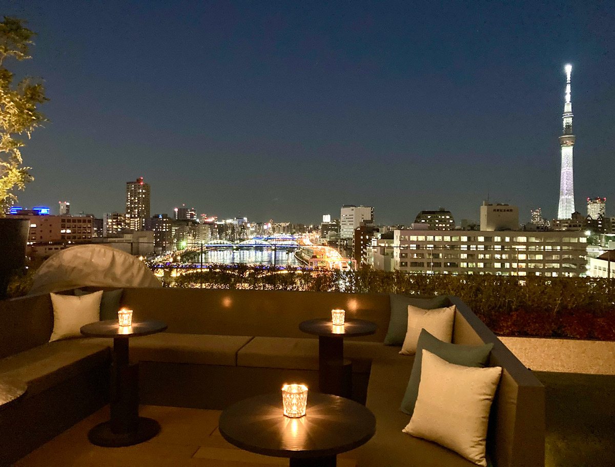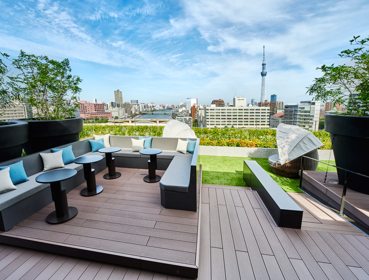 開放感たっぷりのテラス。ここだけで28㎡もあるのだとか!夕暮れ時に訪れたのですが、東京の空が赤から青に染まる様子は息をのむほどの美しさでした。ステイして日の出や夜景も味わえたら…と思わず想像してしまいます。