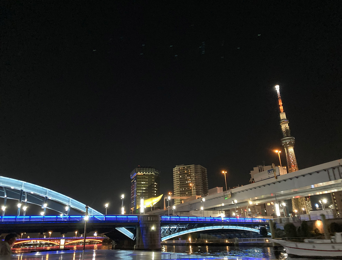 チャータークルーズでは、70分間の隅田川と東京湾のコースを運航予定。隅田川沿いの景色は見慣れたものと思っていたはずが、水上から見上げるとこんなにもドラマチックに映るとは!