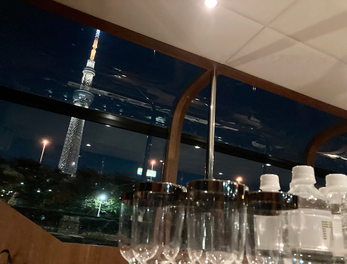 デッキにも自由に出入りできますが、クルーズ船の窓は広く屋内からもばっちりと景色を楽しめます。春は隅田川の桜沿いを運航するお花見クルーズや、夏はビアクルーズ、秋はお月見…などのチャータークルーズも企画しているのだそう。