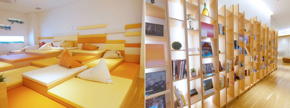 カーテンの奥は半個室のようになっていて、寝ころびながら少し仮眠をとったり本を読んだりと自由に過ごせるスペース。少しだけ暗くて白いカーテンに囲まれているから、繭の中にいるようなとても落ち着く雰囲気です。