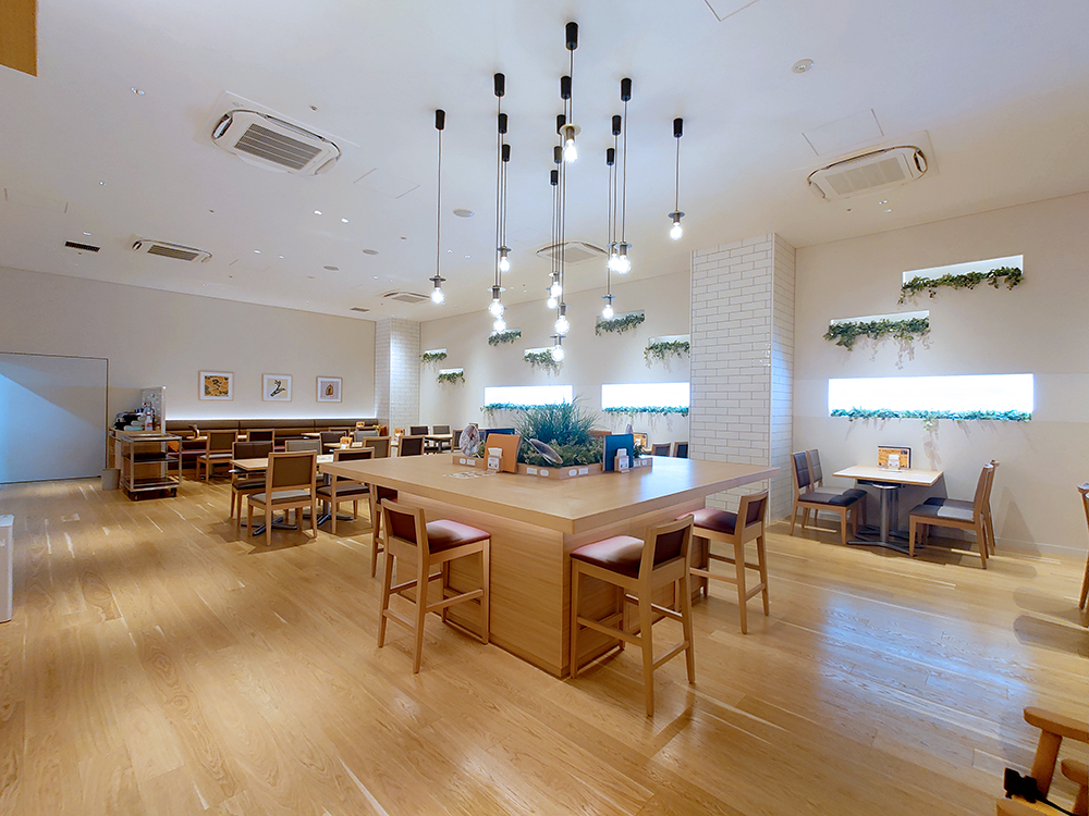 レストラン・カフェスペースは、白と木目を基調としたナチュラルな空間。コンセント完備の席もあるため、ここでリラックスしながらリモートワークをする人も多いんだとか。