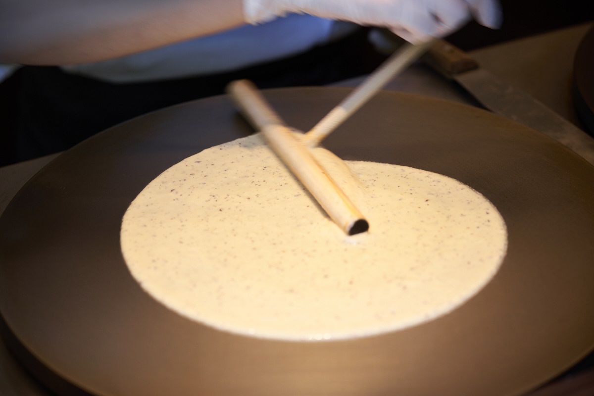 そして、生地にも注目です。生地には米粉を使っているため、もっちりとした食感。さらにラムと皮ごと砕いたナッツを混ぜ入れているので、クレープの皮そのものがおいしいところもおすすめしたいポイントです。