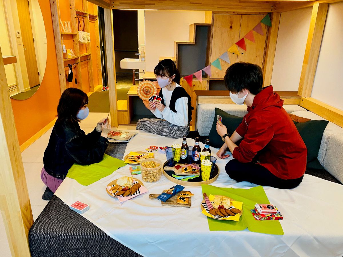 「サイクルルーム」以外にも、とても素敵な客室が2種類用意されています。1つ目は、全34部屋あるヤグラルーム。広々としたソファでは、ゆったりくつろいでお菓子パーティができちゃいます。
