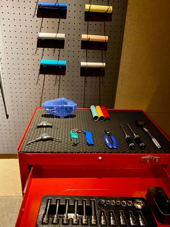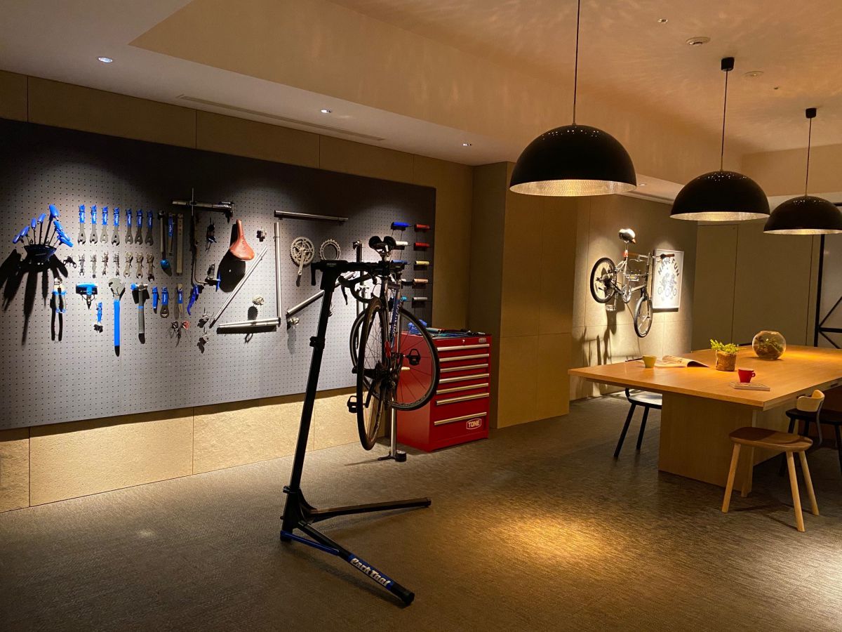 また、「サイクルスペース」と呼ばれるこちらは、愛車のメンテナンスのほか、サイクリストたちの情報交換の場でもあります。自転車メンテナンスの器具も充実していて、どこまでも自転車ファーストを感じますが、そうかと思えば、珍しい器具が壁にレイアウトされている様子がSNS映え!ということで写真スポットにもなっているそう。サイクリストも自転車初心者も一緒に楽しめる空間づくりが、とても心地いいんです。