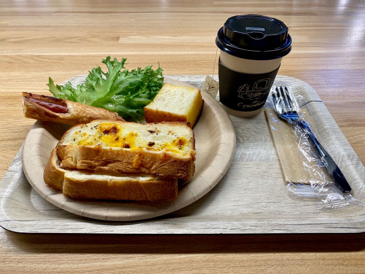 じゃーん!こちらが「Couronne」の朝食プレート。大きなクロックムッシュのほかに、ソーセージの入ったパンやミニサラダ、ドリンクもつくので、ボリュームも申し分なし!クロックムッシュはチーズがたっぷり入って、ハムとパンとの相性も最高!食べれば食べるほど食欲がわき、元気が出てくるおいしさでした。