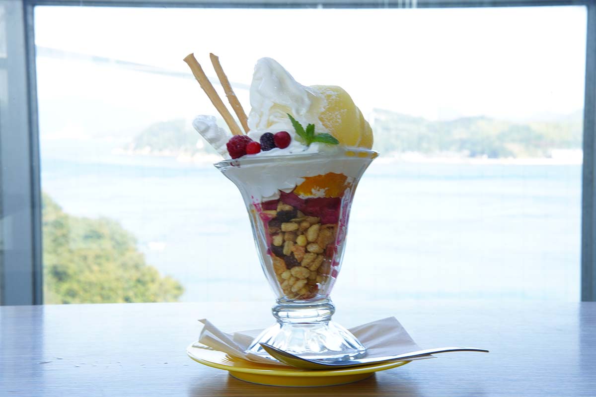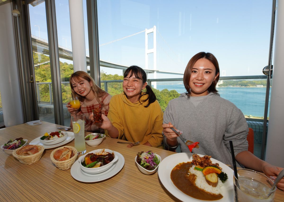 今回のスタート地点だったターミナル「サンライズ糸山」には、愛媛グルメが食べられるレストランを併設しています。朝早く出発するサイクリストから、夕方遅くに愛媛に到着するサイクリストまで、ご当地素材のメニューで出迎えてくれます。そしてこの眺望!
