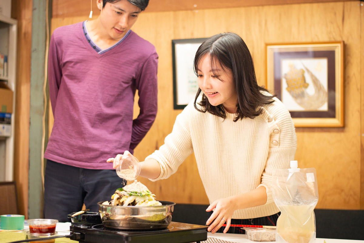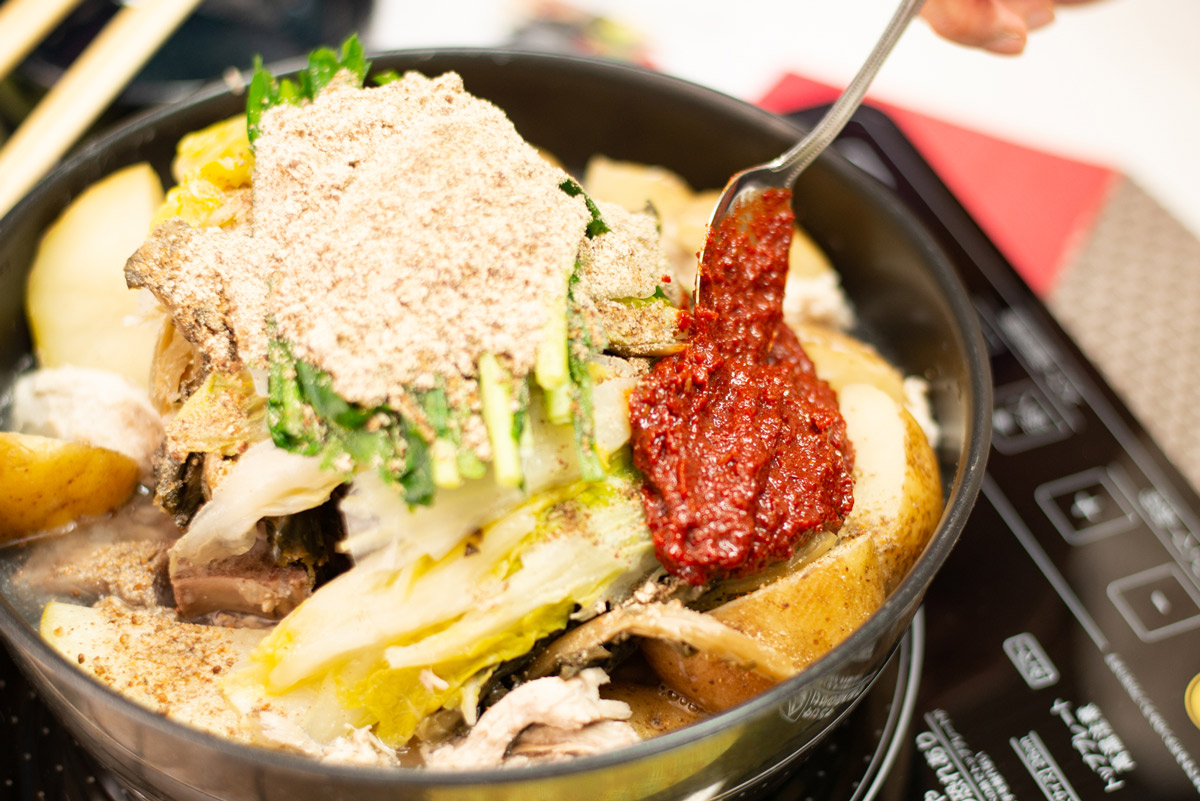最後に、カムジャタンに欠かせない調味料のひとつ「えごまの葉の粉末」を入れたら、準備完了。なんと、たった4〜5分で、鍋の準備が完了しました。この後、強火で鍋を加熱していきます。