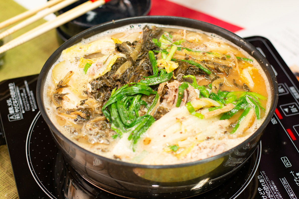 原材料名:豚背骨、豚ロース、白菜、ジャガイモ、ニラ、大根の葉、えごま粉末、味付調味料(イワシエキス、コチュジャン、みそ、しょうゆ、唐辛子粉末、ニンニク)