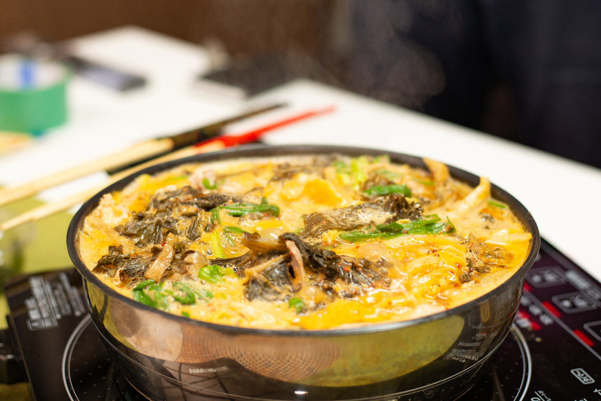 ここでいったん、味見をするのがオススメ。辛味や塩気が足りないと感じたら、このタイミングでタデギをプラスしましょう。反対に味が濃いと感じたら、スープ、あるいは水とタデギを加えます。