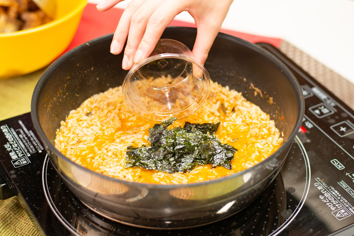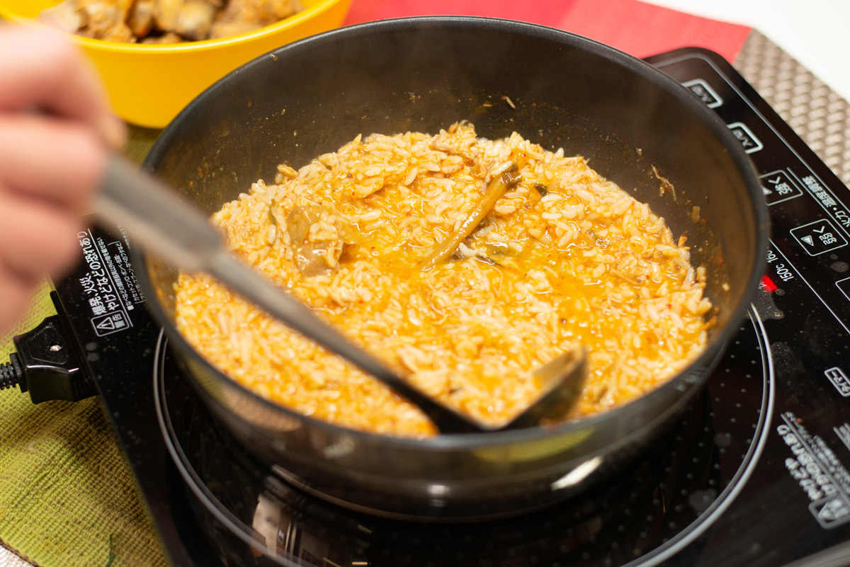 旨みが凝縮されたスープは、残さずいただきたいところ。カムジャタンセットについているごはんを入れ、スープがすべて吸収されるまで煮込みます。ごはんの代わりに、うどんやラーメンを入れてもOKです。