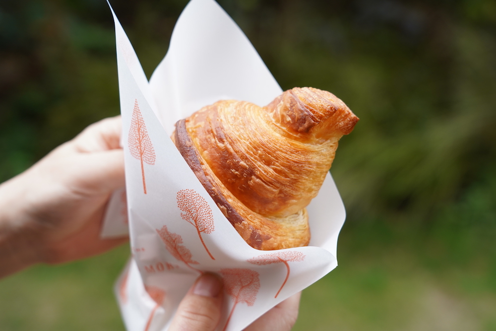 そして、ケーキの横にありました。みんなのお目当て、クロワッサン!実はオープン当初は計7種類のクロワッサンが用意されていたのですが、あまりの人気ぶりに、2種類のみに絞り込み、さらに1人2つまでの数量限定で販売されています。テイクアウトもできますが、できれば焼きたてをイートインで!
