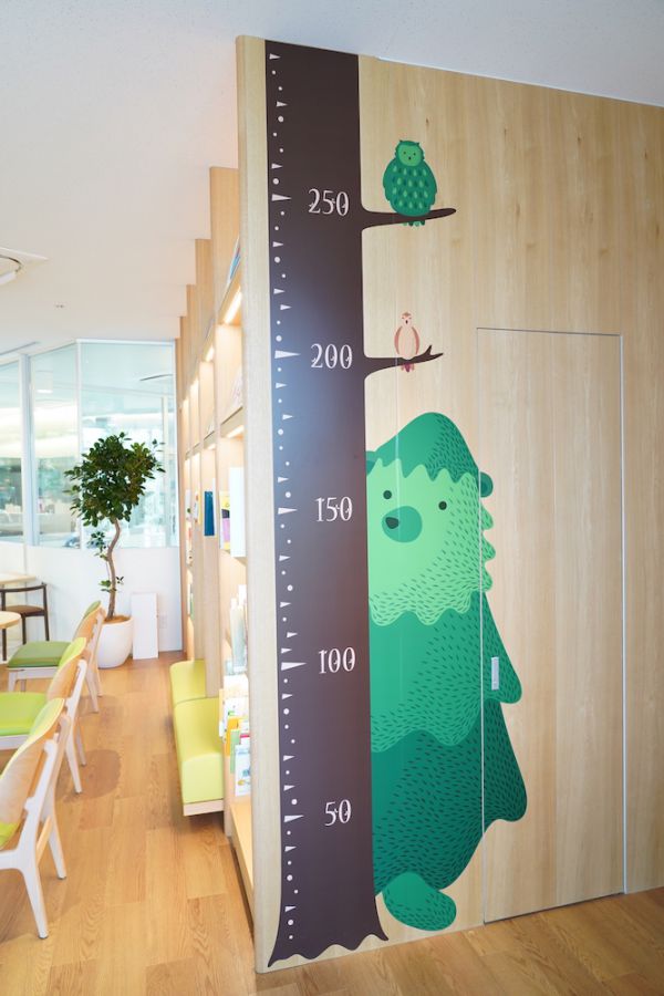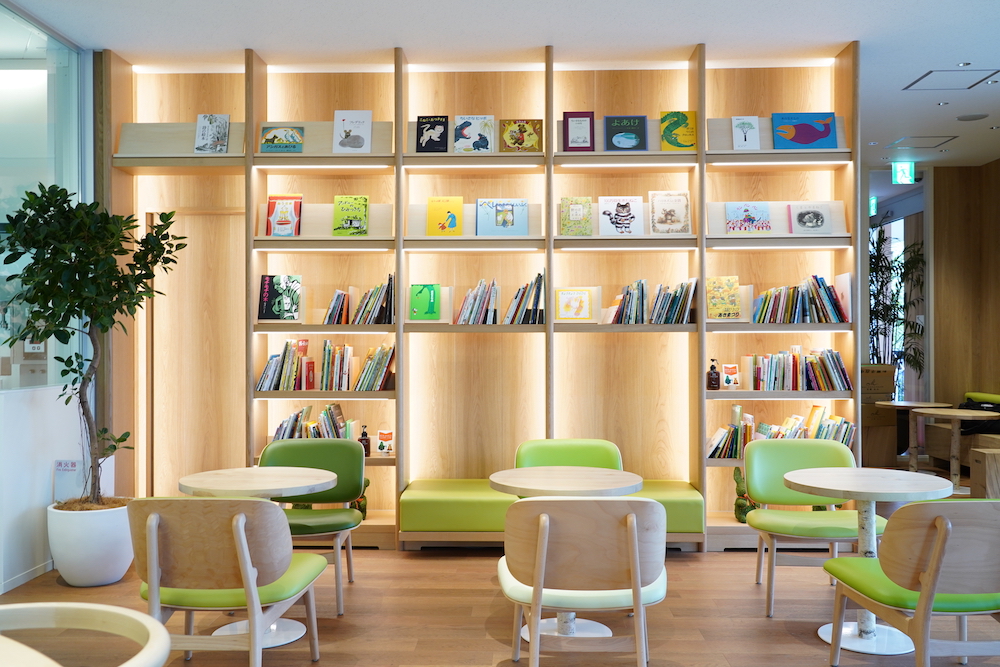 本棚には、京都市左京区にある絵本と児童書の専門店「絵本屋きんだあらんど」が、“森、食、家族”をテーマに選書した約380冊の本が並びます。かわいらしい表紙に、大人が見てもワクワク。