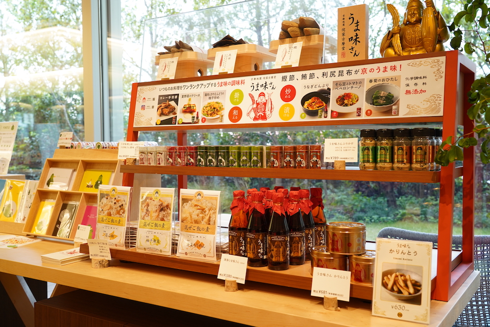 本社所在地だけあって、ショコラトリー「加加阿365」やうま味調味料専門店「京都祇園 侘家古暦堂 うま味さん」など、同社ブランドの商品も集まって華やかな品揃え。ショッピングするだけでも楽しめますよ。