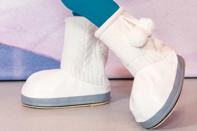足もとはホワイトの暖かなフェルト生地に、ニットの編み目模様が施されたブーツで。