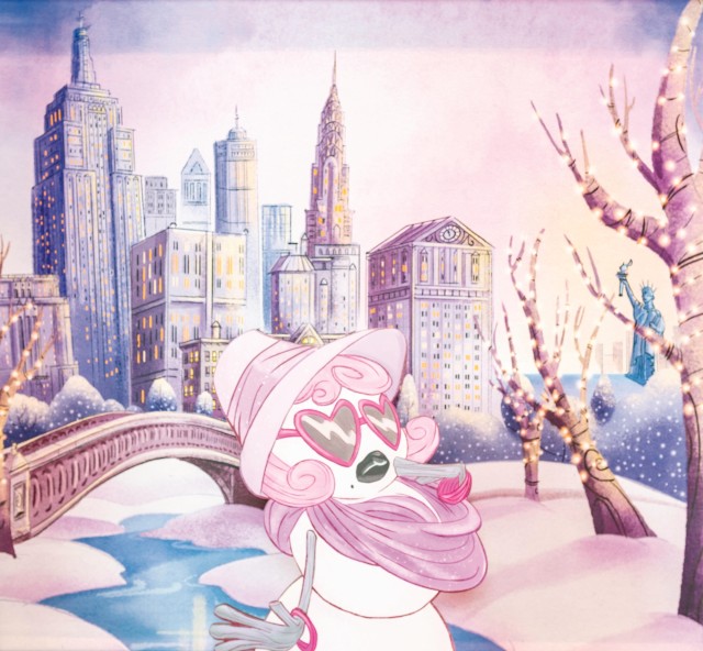 コスチュームに合わせて、背景のスクリーンも冬バージョンに変更。ニューヨークのセントラルパークから望む高層ビル群を背にイルミネーションが灯り、真っ白な雪につつまれた公園が描かれています。奥には自由の女神像も。