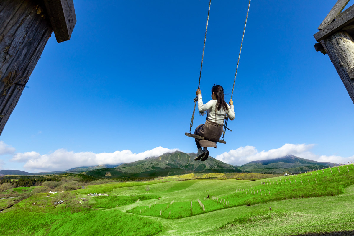 ブランコは大小合わせて18基も。写真は農場のヒルトップにある高さ約5mブランコです。くじゅう連山に向かって漕ぐと、高原の風にふわっと体が浮かびあがり、谷に飛び出すような感覚に!