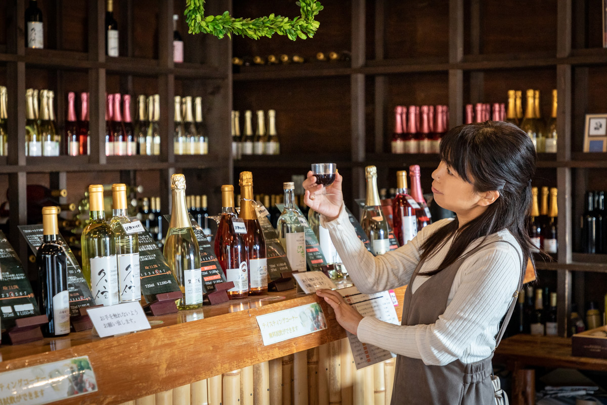 ショップでは赤・白・ロゼ・スパークリングなどのバリエーション豊かな久住産ワインを試飲しながら選べます。ドライバーやお酒が飲めない人は、濃厚な味わいのブドウジュースをお試しあれ。