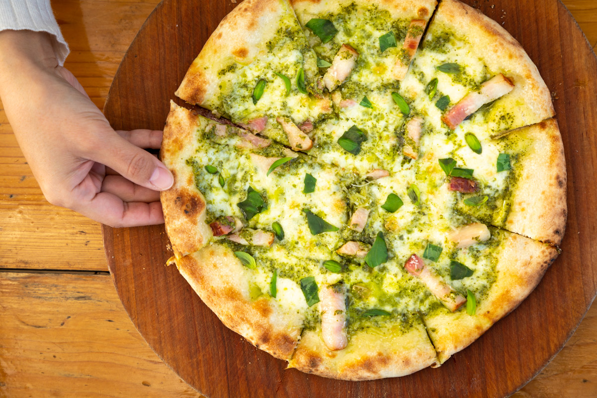 ランチはショップの向かいにあるイタリアンの「レストラン石窯工房」で。高温の石窯で焼き上げたピザは香ばしくて、もっちもち。写真の「ジェノベーゼ」(通常サイズ1573円)など定番で5種類、季節メニューで2種類があります。通常サイズで直径約27cm、LLサイズで直径約34cmあるので、シェアして味わって。