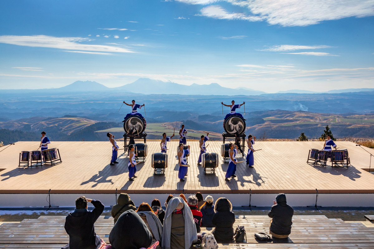 和太鼓の野外ライブをお目当てに「野外劇場 TAO(タオ)の丘」へ。客席は丘を利用した階段状で、舞台の後ろには阿蘇五岳が遮るものなく広がっています。この贅沢すぎる天空の舞台で、和太鼓エンターテイメント集団「DRUM TAO(ドラム タオ)」のライブが開演。