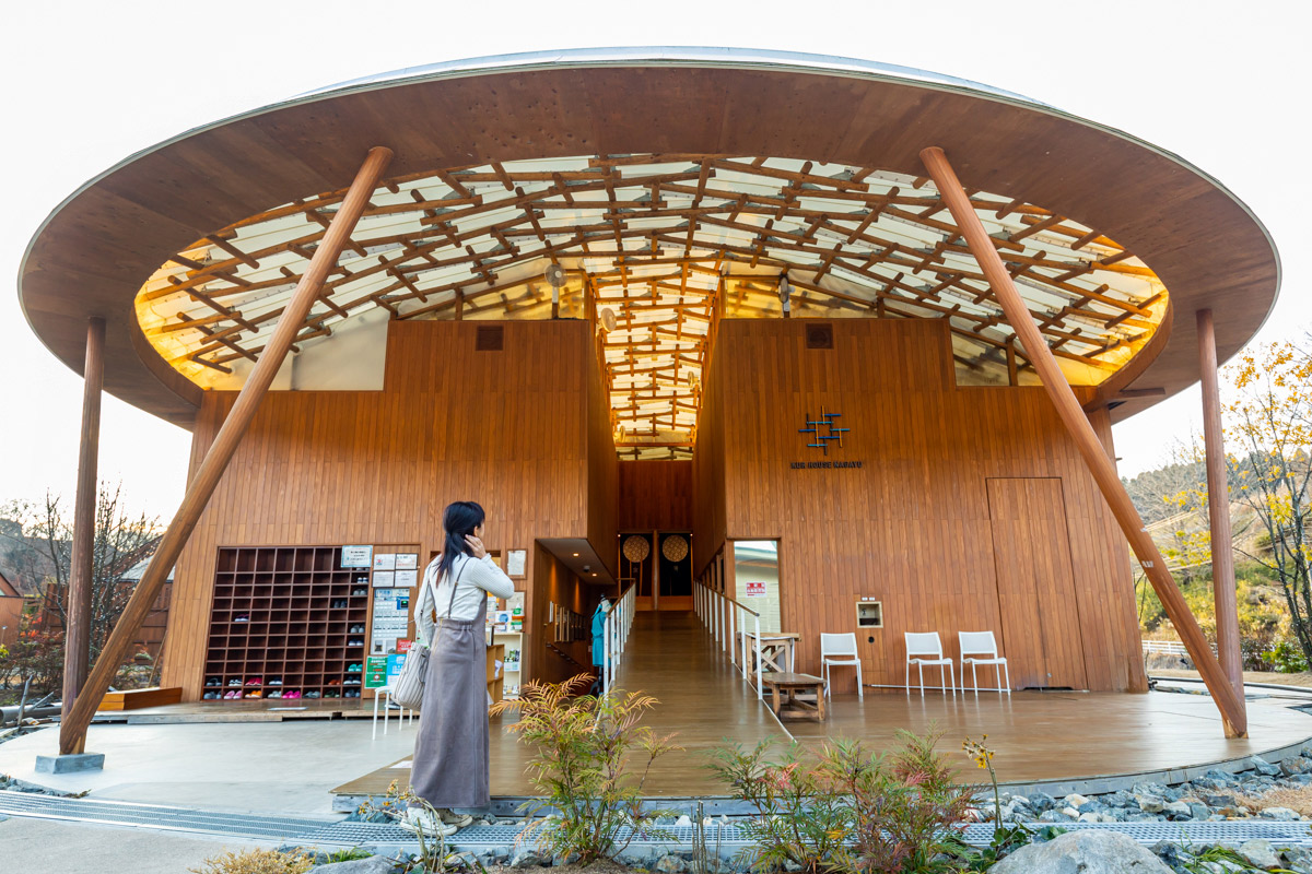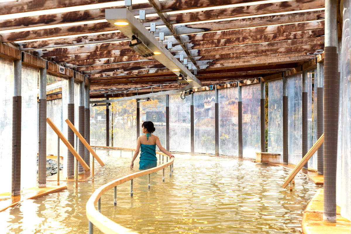 4本の丸太が支え合う木造建築のクアハウスは、世界的建築家・坂茂(ばん しげる)氏によるもの。1階に水着で入浴するバーデゾーン、2階に男女別内湯と更衣室があります。水着は500円でレンタルも。