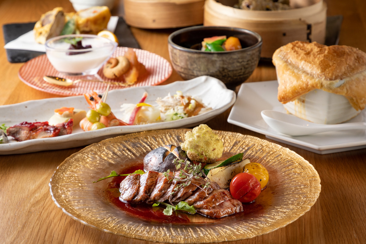 夕食はレストラン棟でいただきます。和洋中のシェフが一緒にメニューを考案し、多国籍の料理を提供。取材時にはクラムチャウダーパイ包みや豊後牛のカルパッチョ、中華ちまきなど、7品が登場しました。牛肉を重炭酸泉に漬けて、柔らかくするのも温泉施設ならではのテクニックです。