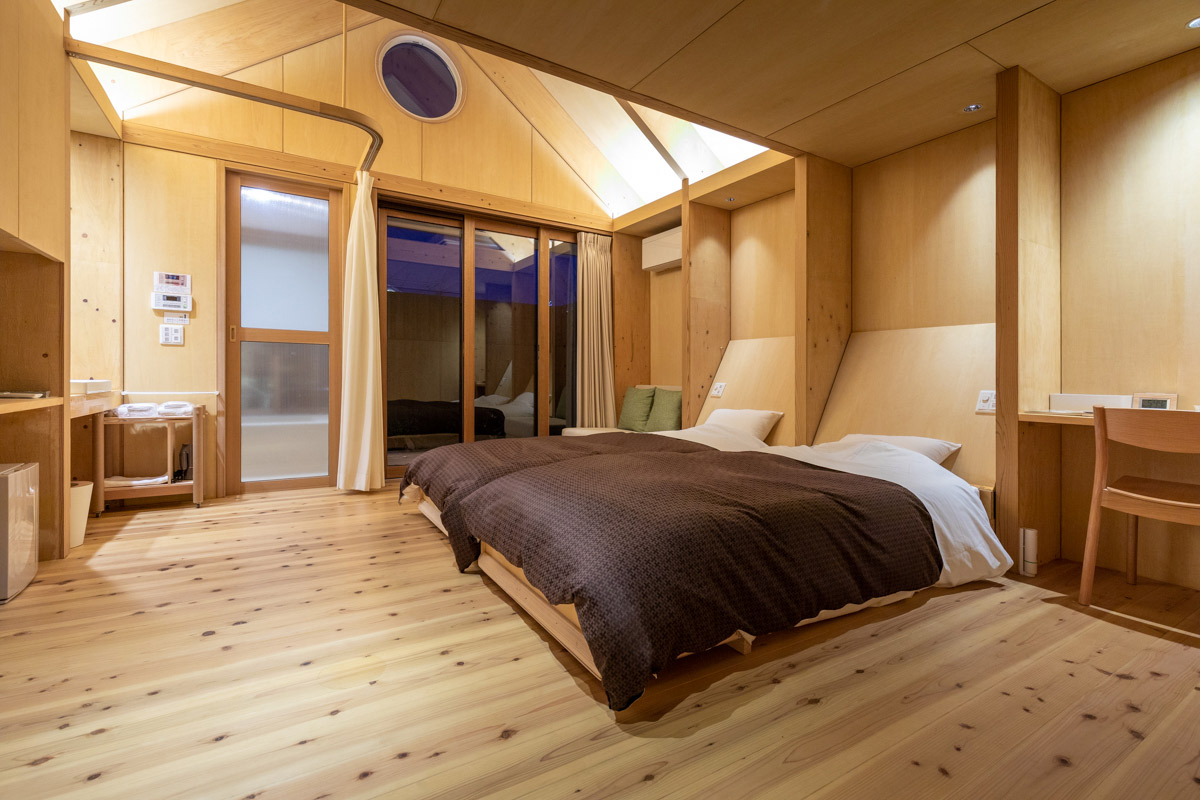 客室はコテージタイプで、自然のままの木材を活かした落ち着ける空間。全室ウッドデッキ付きで、写真のツインルームの天窓からは星空も見えます。宿泊するとクアハウスを7時から20時30分まで利用できるので、温泉ざんまいが楽しめます。