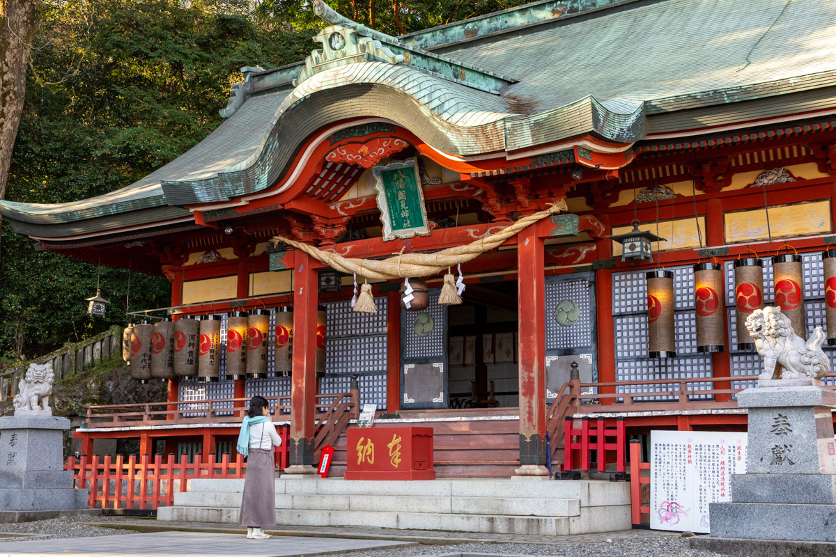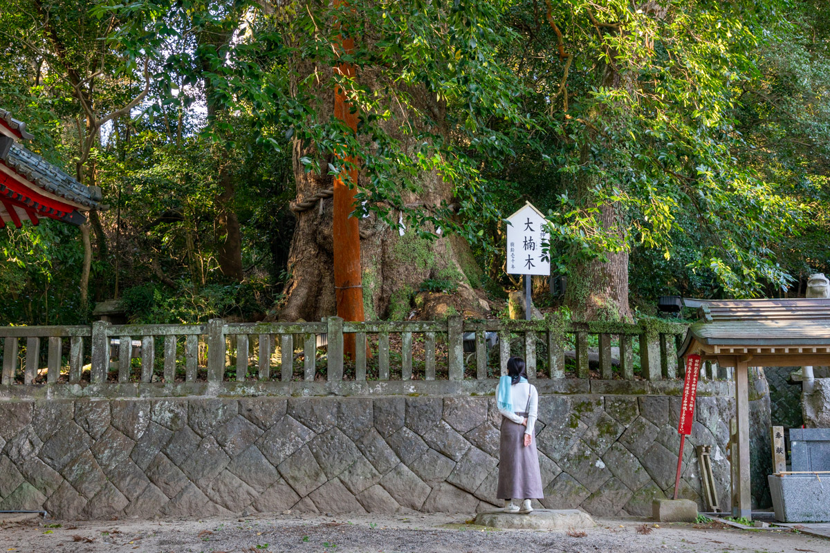 美しい朱色の御本殿にお参りしたら、傍らに立つ御神木の大くすの木にも手を合わせて。樹齢1000年超えとは思えないほど枝ぶり豊かで、生命力に満ちています。木のそばにある石の上に立って、パワーを授かりましょう。