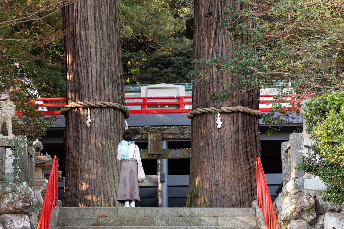 表参道の階段を上った先には、2本の杉の巨木が門のようにそびえたっています。寄り添うような立ち姿から夫婦杉とよばれ、2本の間をカップルや夫婦で通り抜けると幸せになれるといわれているんですよ。