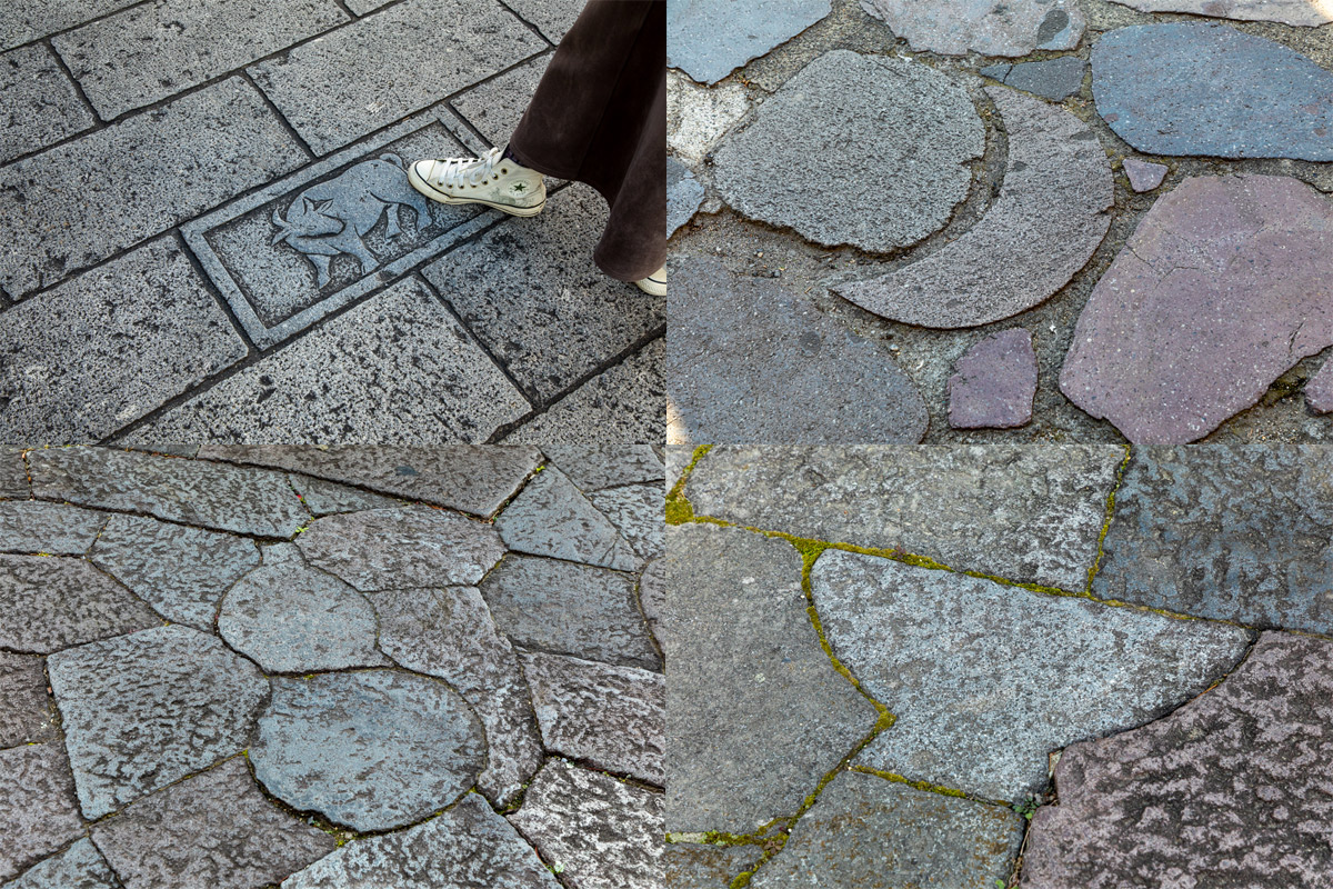 朝見川に架かる御幸橋から続く表参道を歩くと、一風変わった敷石が見つかります。一ノ鳥居の近くには干支の敷石があり、その年の干支を踏むと運気がアップするのだとか。二ノ鳥居の先には、三日月やひょうたん、盃の形の敷石を発見。参道を作った昔の職人がお酒好きだったからとか、断酒の願いを込めたからとか、理由は諸説あるそう。