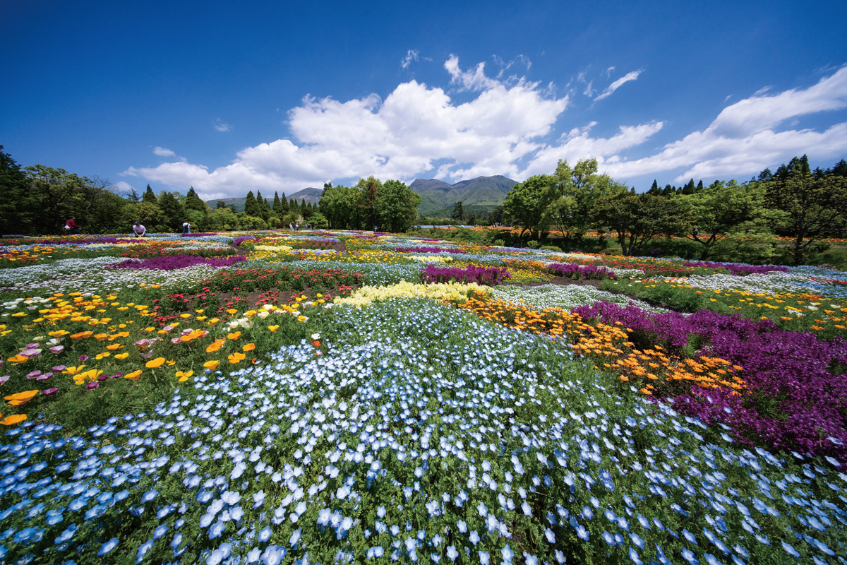 約22万㎡の敷地いっぱいに咲く花々と出合える「くじゅう花公園」。4・5月はパンジーやチューリップ、芝桜、ネモフィラなど、年間を通じて一番多くの種類の花が咲くベストシーズンです。
