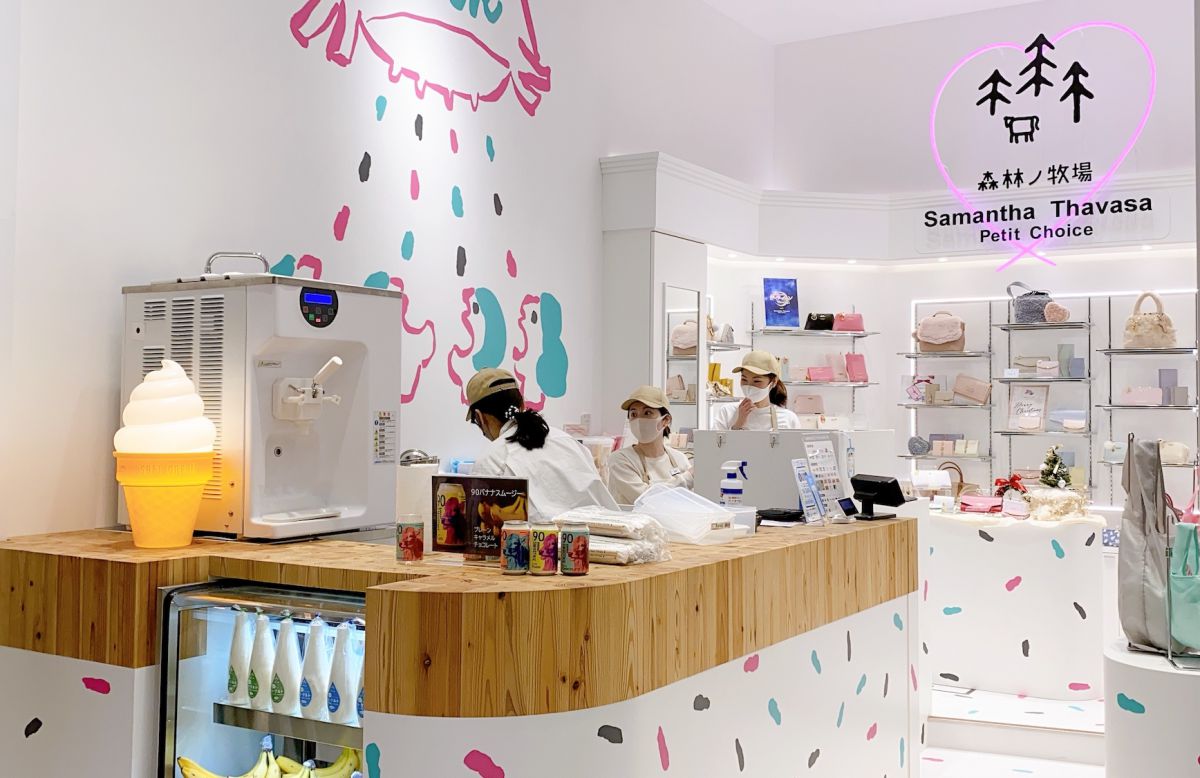 オトナ女子の“カワイイ”のアイコン『Samantha Thavasa(サマンサタバサ)』が、那須高原で持続可能な酪農を営む『森林ノ牧場』と出会い、実現したコラボストア。ここ『森林ノ牧場 ♡ Samantha Thavasa Petit Choice』は全国2店舗目で関西初出店となりますが、1店舗目は羽田空港のゲートの中。飛行機に乗らない人でも入れる実質初めての実店舗です。