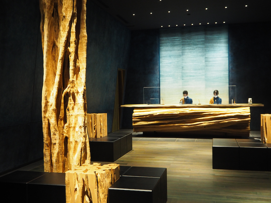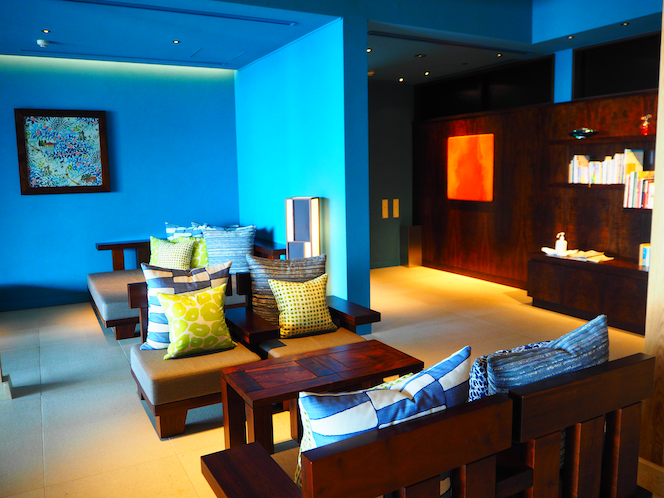 那覇空港から車で沖縄自動車道を利用すると約60分。ほのぼのした読谷村のサトウキビ畑を過ぎると長い海岸線に沿って、昔のグスク(城)を護るような高い壁が見えてきます。この中が「星のや沖縄」。まずは、深海をイメージしたレセプションへ。