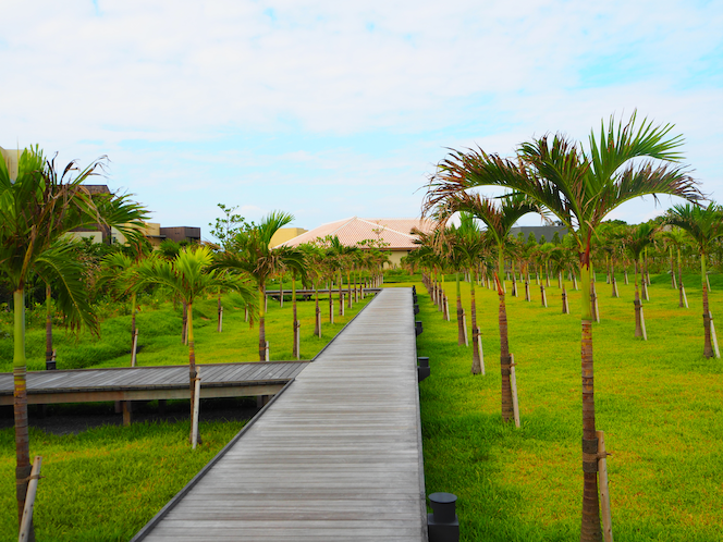「星のや沖縄」は、自然の景観を活かした造りになっていて、ガジュマルの並木にそって1kmにわたって波打つような壁に囲まれています。門をくぐると広い敷地は、南国の緑と花に彩られ、ウッドデッキが各棟に向ってずっと続いています。