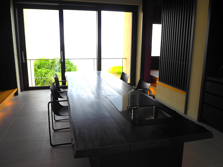 3タイプあるどの部屋にも大きなダイニングテーブルのある「土間ダイニング」が設けられていて、簡単な調理の機能も。好きな時間にお料理を温めたり、ゆったりお茶を飲んだり、まるで海を望む別荘に来たように寛げます。