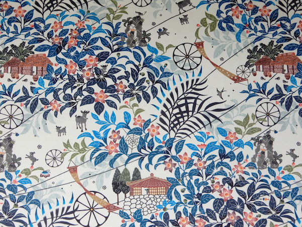 「星のや沖縄」では、そこそこに沖縄文化を感じるモチーフが散りばめられています。客室のベッドボードは沖縄紅型で沖縄の暮らしが描かれ、細かな絵柄の中にかわいいヤギの親子が隠れています。やんばるの山の中で迷うヤギの親子など読谷の伝説にものっとっていて、思わずヤギたちの姿を探してしまいます。そのほかにも「やちむん」「金細工(くがにぜーく)」などの工芸品がお部屋を彩ります。