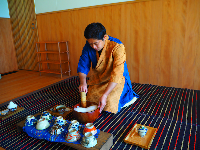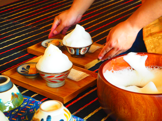 珍しいぶくぶく茶は、古くから沖縄で親しまれた飲みもの。クリーミーな泡を立てながら、旅人に幸せな航海になるように願いをこめて振る舞われたとのこと。ありがたくおいしくいただきました。