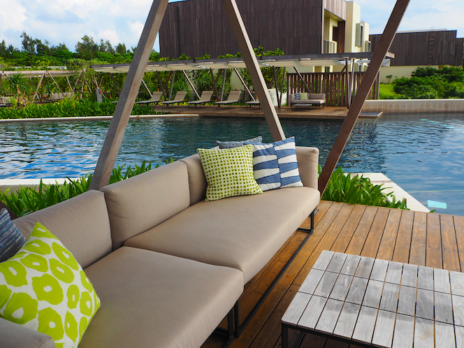 プールは海に続いていくかのようなインフィニティ。1年中、心地よく泳げる温度に保たれていて、24時間利用できます。子供が遊べる場所から大人が泳げる深さまでバリエーションがあって、水盤に椅子が配されたようなエリアやプールサイドにもソファやリクライニングチェアなどもあって1日中いても飽きません。夕暮れのサンセットから日が落ちた後のライトアップされたプールもまたロマンチック。