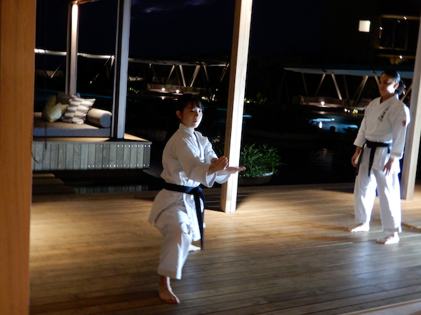 プールに面した「集いの館」は、常時、シークワーサージュースやさんぴん茶などのドリンクがちょっとしたスナックが置かれた寛ぎのスペース。夕刻には、琉球音楽や空手の演舞を披露する宵の座が催されます。琉球空手の美しい型と迫力ある演舞に魅せられました。