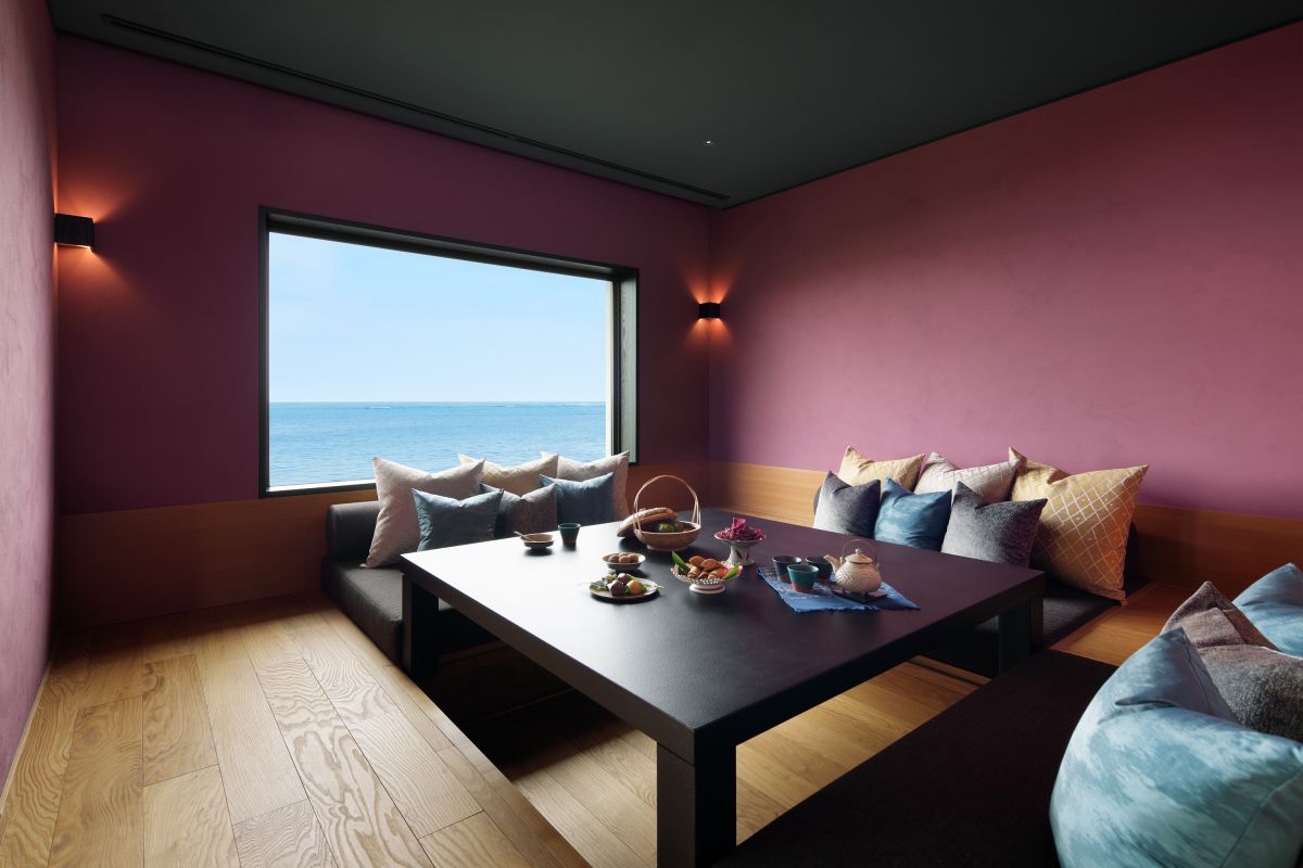 お部屋に入って、まずは大きな窓の向こうに広がる海の景色に息を呑みます。目の前をサップを楽しむ人や遠くには船が行き交い、見ていて飽きることのない美しさ。客室は、海への近さを実感できるよう2階までの低層になっていて、100室すべての部屋から絶景の海が見渡せるのです。