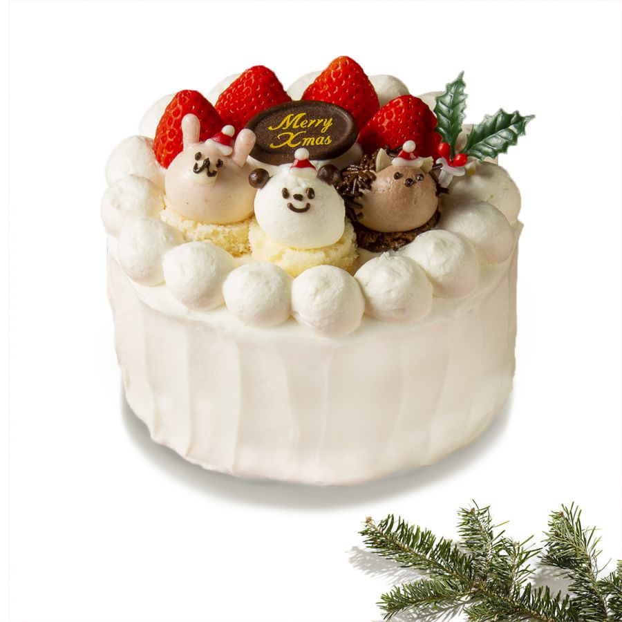 ホールで買える「いちごのショートケーキ」には、どうぶつカップケーキの人気者「バニラパンダ」、「うさぎストロベリーチーズ」、「はりねずみチョコ」がサンタに変身して大集合。優しい甘みに、風味豊かな味わいクリーム3種類を絞って仕上げた動物たちがクリスマスを楽しくしてくれます。