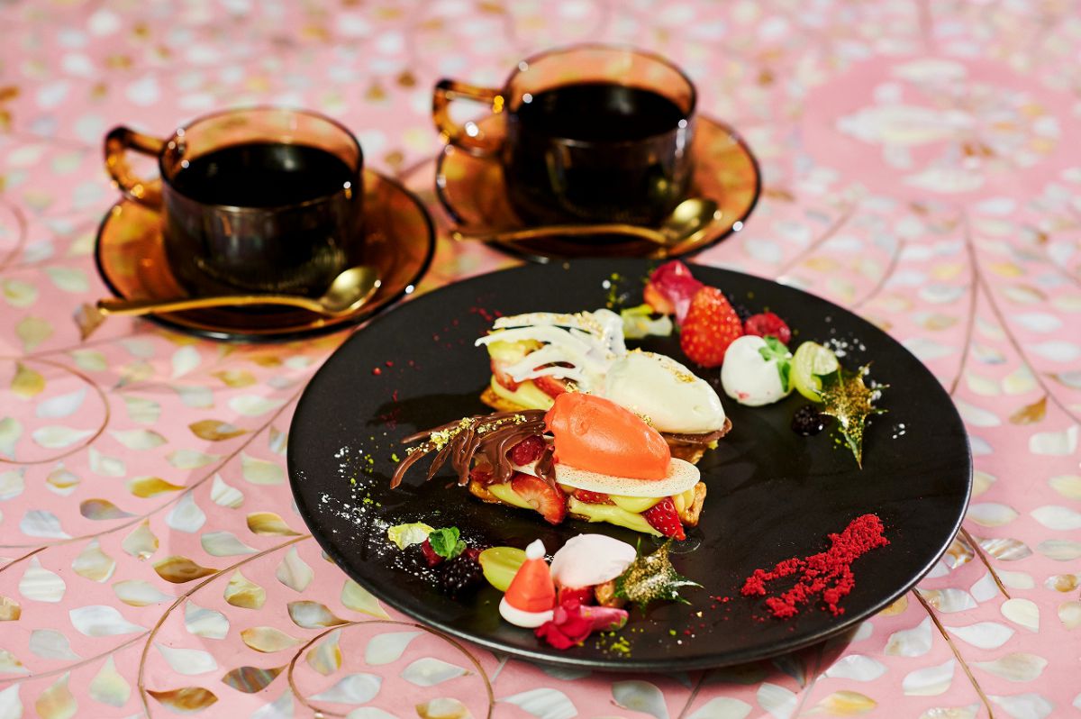 アートアクアリウムの作品を楽しんだ後はカフェ「華魚繚乱」で、見た目も味も楽しめる「金魚スイーツクリスマスペアプレート」を食べながら甘い時間を過ごせます。