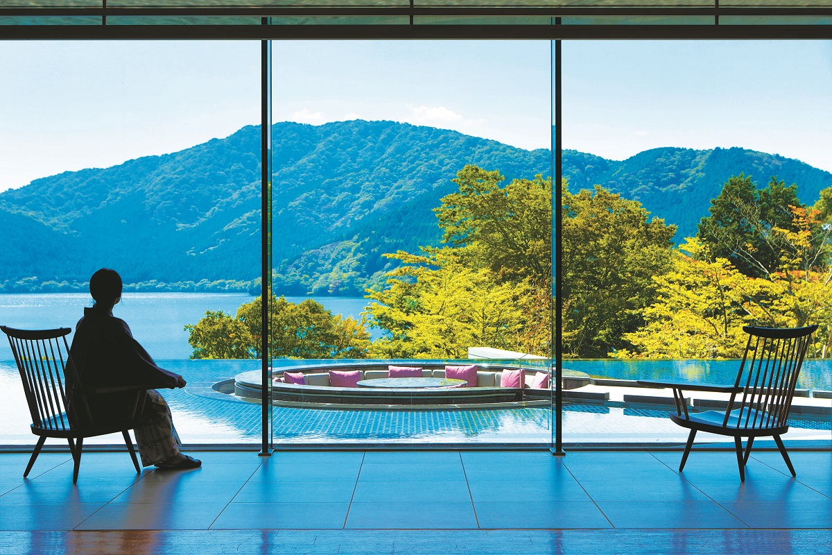 こちらのお宿でまず目を引くのは、芦ノ湖と箱根の山々に面して設けられたオープンエアの「水盤テラス」と「足湯カウンター」です。水盤テラスに座ると自分が芦ノ湖と一体化したような錯覚を起こしそう。旬の食材を生かした食事や雄大な眺望を楽しみながら浸かる箱根の名湯を満喫できますよ。