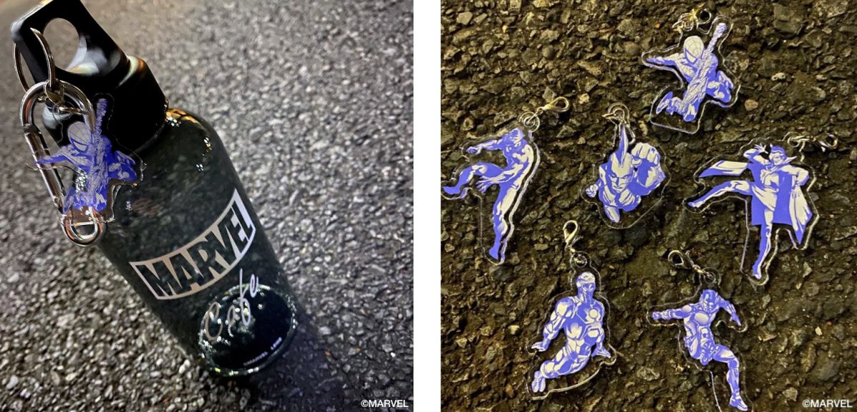 右「MARVEL」ティーボトル 699円/ボトル&チャーム付き+1200円