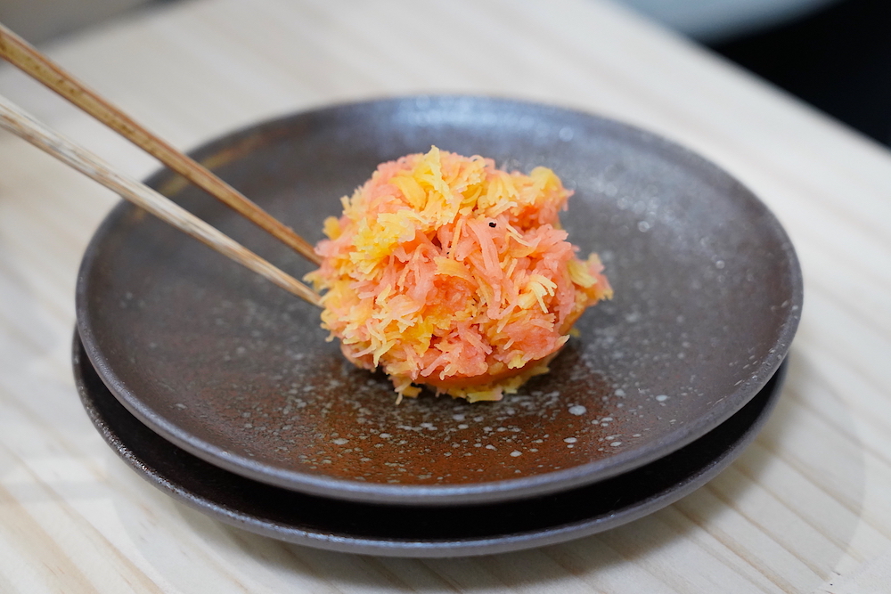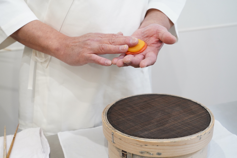 街路樹が色づきはじめたこの時季の生菓子は、「錦秋」。まず手に取るのは、濃淡の橙色に染めた白あんです。備中の白小豆と手亡(てぼう)豆をあわせて、ほどよいやわらかさに炊き上げてあります。