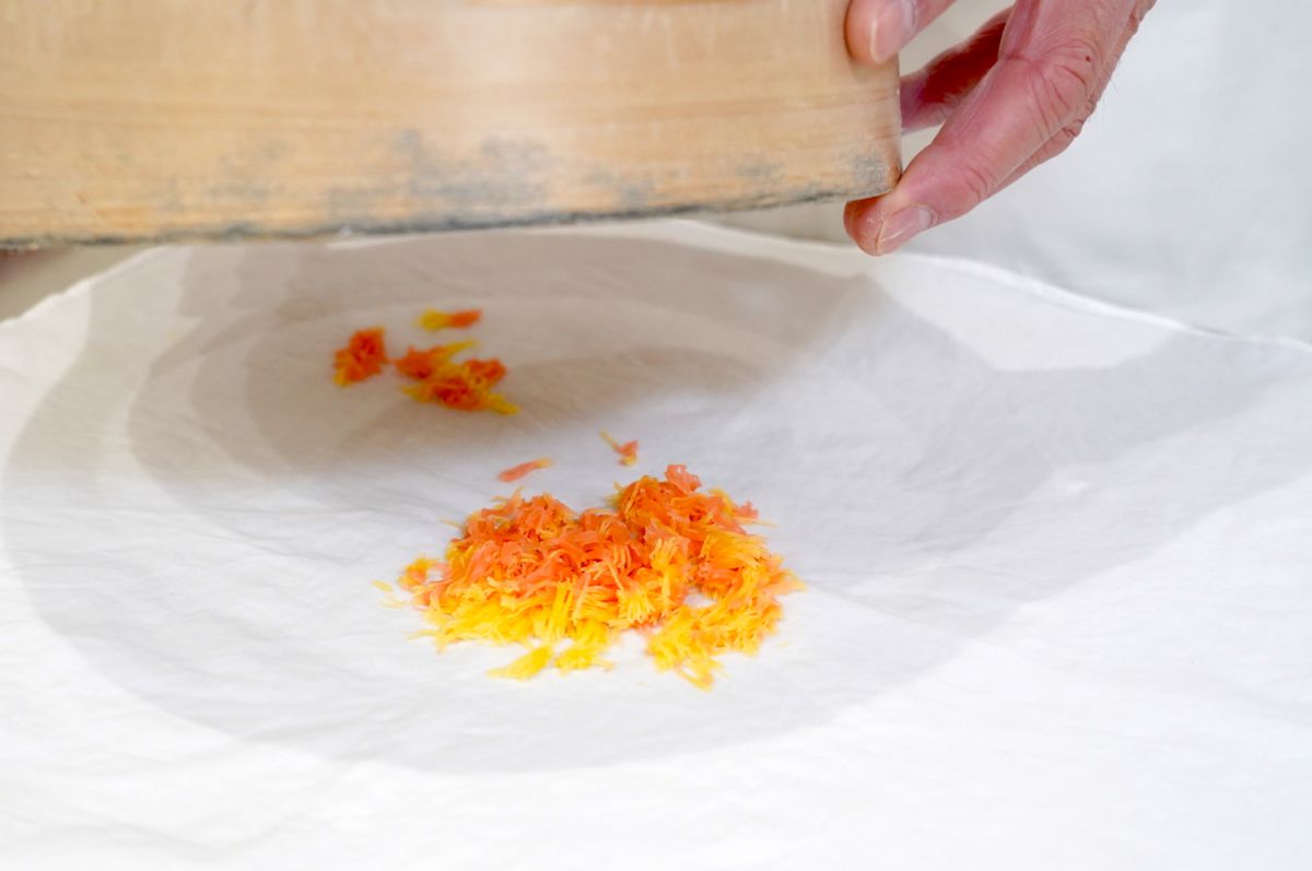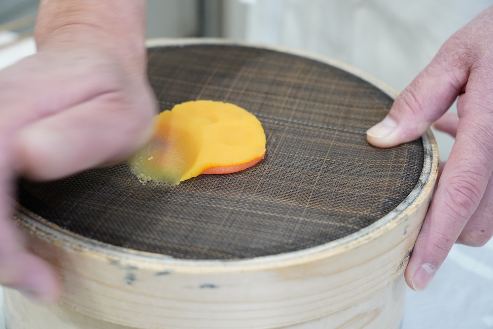 リズミカルに、馬毛の、微塵目のうらごしに押し当て、まるで錦絵のように色鮮やかなそぼろをつくります。